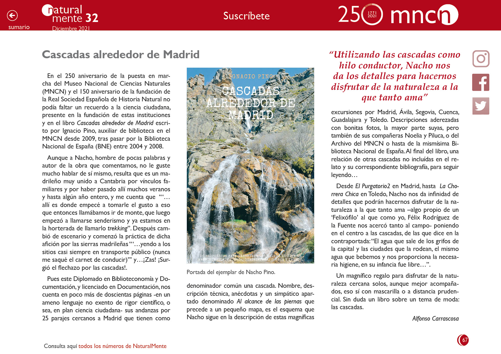 En el 250 aniversario de la puesta en marcha del Museo Nacional de Ciencias Naturales (MNCN) y el 150 aniversario de la fundación de la Real Sociedad Española de Historia Natural no podía faltar un recuerdo a la ciencia ciudadana, presente en la fundación de estas instituciones y en el libro Cascadas alrededor de Madrid escrito por Ignacio Pino, auxiliar de biblioteca en el MNCN desde 2009, tras pasar por la Biblioteca Nacional de España (BNE) entre 2004 y 2008.