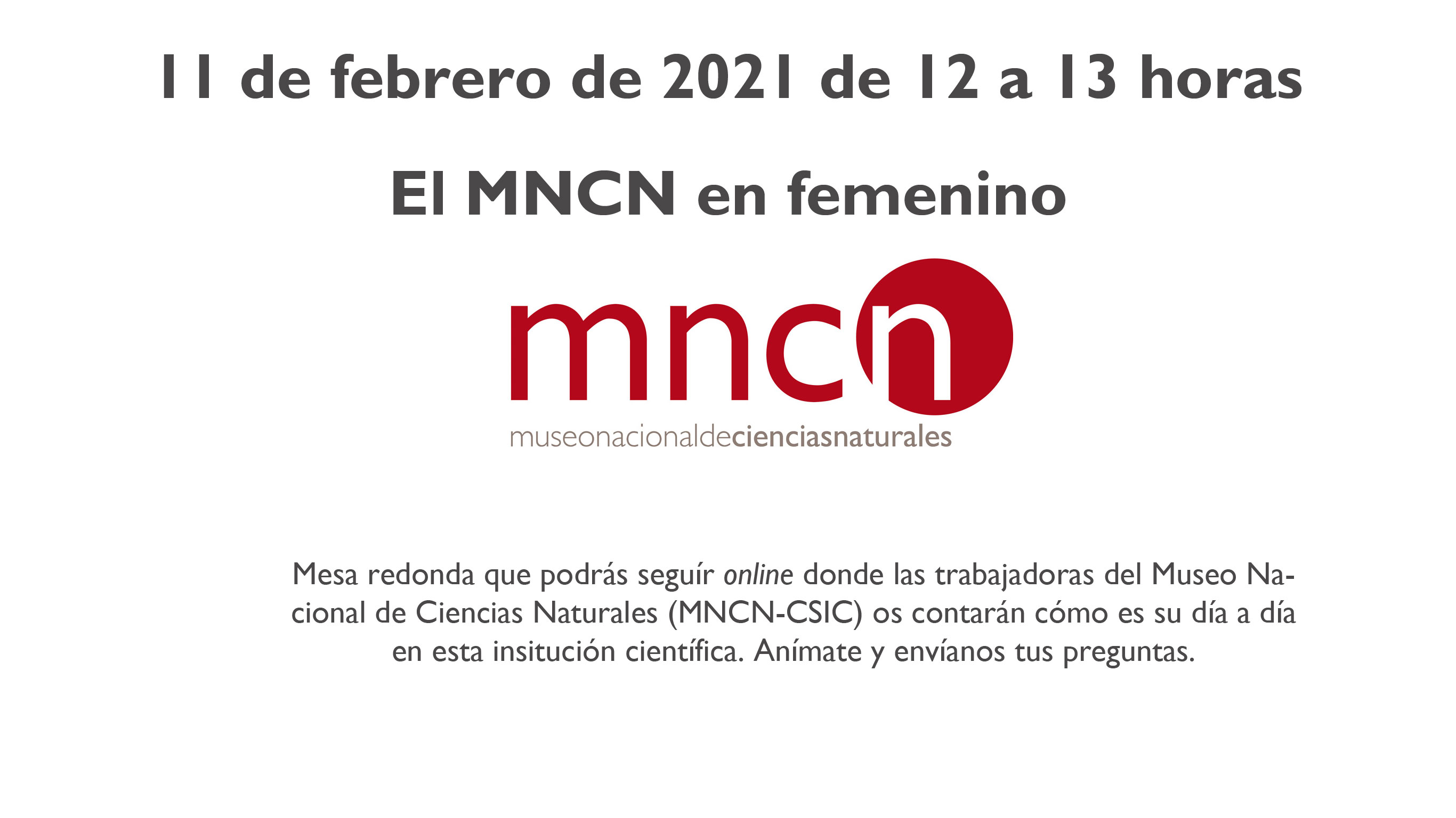 El próximo jueves 11 de febrero el Museo Nacional de Ciencias Naturales (MNCN-CSIC) ha preparado un evento online para que el alumnado de entre 10 y 14 años conozca, de la mano de las implicadas, el día a día de las trabajadoras del museo. La actividad, que contará con una intérprete de Lengua de Signos Española, tendrá lugar en el salón de actos del MNCN y la asistencia será virtual. A través de este enlace se podrá seguir la charla en directo y los participantes podrán hacer preguntas a través del chat habilitado. “Es una oportunidad para que el alumnado de cualquier rincón del mundo pueda interactuar con el personal del MNCN y conocer más de cerca cómo ha cambiado esta institución que este año celebrará su 250 aniversario”, comenta Pilar López García-Gallo, vicedirectora de Comunicación y Cultura Científica del MNCN.