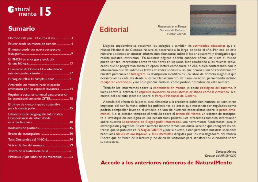 Llegado septiembre se reactivan los colegios y también las actividades educativas que el Museo Nacional de Ciencias Naturales desarrolla a lo largo de todo el año. Por eso en este número podemos encontrar información abundante sobre la labor educativa y divulgativa que realiza nuestra institución. En nuestras páginas podrán conocer cómo una visita al Museo puede ser tan interesante como varias horas en las aulas, bien acudiendo a las muchas actividades que se programan, tanto en época lectiva como fuera de ella, o bien contactando con la información que difundimos a través de redes sociales a las que hemos sumado recientemente nuestra presencia en Instagram. La divulgación científica es una labor de primera magnitud que desarrollamos cada día desde nuestro Departamento de Comunicación, permitiendo incluso recuperar vocaciones y no solo produciéndolas, como podrán descubrir en este número.