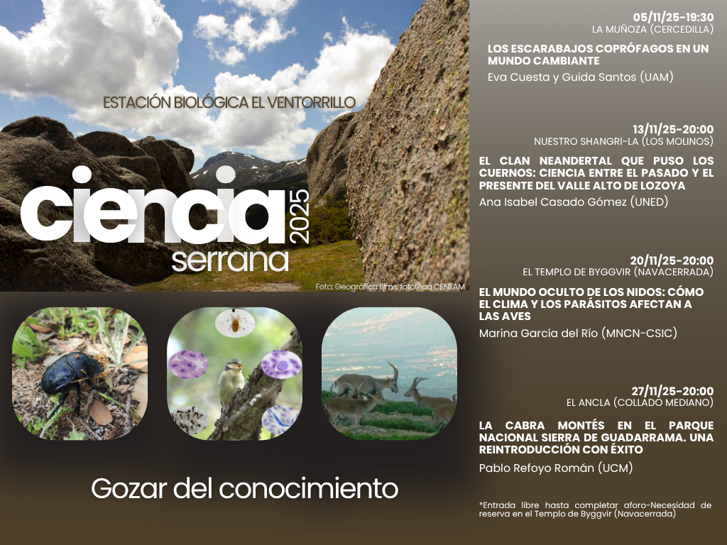 El cinco de noviembre dará comienzo la sexta edición de Ciencia Serrana, una iniciativa del Museo Nacional de Ciencias Naturales (MNCN-CSIC), que este año incluye la participación de personal investigador de las universidades Autónoma, Complutense y UNED de Madrid. Con el lema Gozar del conocimiento, esta iniciativa de la Estación Biológica El Ventorrillo del MNCN, cuenta con la colaboración de diferentes establecimientos hosteleros de la sierra de Madrid que ceden su espacio todas las semanas de noviembre. Estos eventos son especialmente enriquecedores porque, una vez terminada la charla, el público asistente podrá preguntar y charlar con los ponentes en un ambiente distendido.
