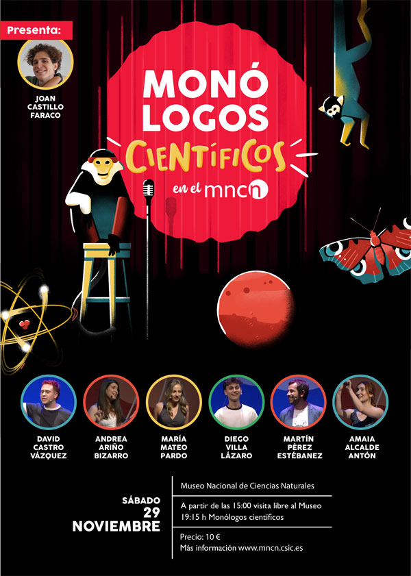 El próximo sábado 29 de noviembre a partir de las 19.15 investigadoras e investigadores así como comunicadores científicos desplegarán todo su talento en el Museo Nacional de Ciencias Naturales (MNCN-CSIC). A través de monólogos cargados de datos y humor, seis profesionales relacionados con el mundo de la ciencia nos contarán algunos de los misterios de la ciencia y la cultura con temáticas que van desde la biología molecular a la filología. La entrada para asistir a los monólogos incluye la visita al MNCN y se puede adquirir dese este enlace.