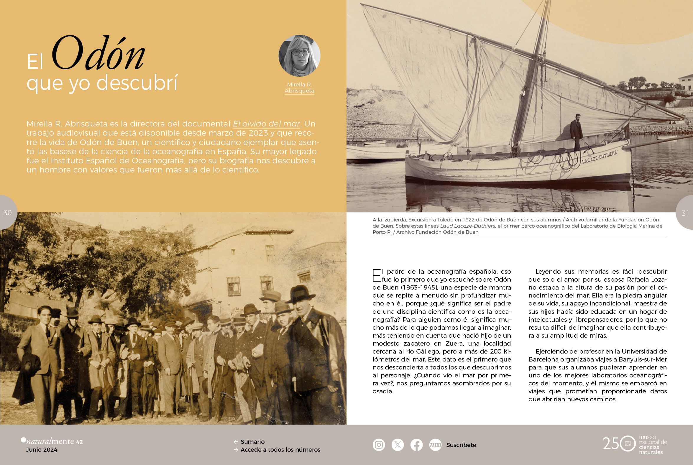 Mirella R. Abrisqueta es la directora del documental El olvido del mar. Un trabajo audiovisual que está disponible desde marzo de 2023 y que recorre la vida de Odón de Buen, un científico y ciudadano ejemplar que asentó las basese de la ciencia de la oceanografía en España. Su mayor legado fue el Instituto Español de Oceanografía, pero su biografía nos descubre a un hombre con valores que fueron más allá de lo científico.