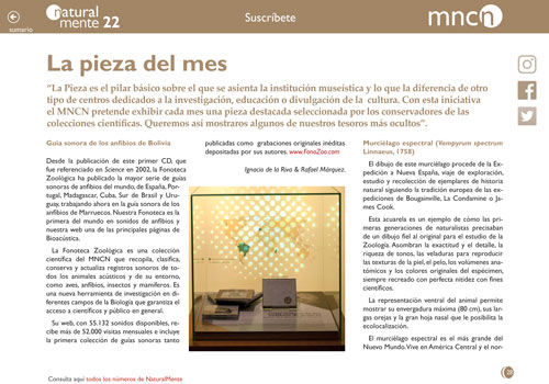 La Pieza es el pilar básico sobre el que se asienta la institución museística y lo que la diferencia de otro tipo de centros dedicados a la investigación, educación o divulgación de la cultura. Con esta iniciativa el MNCN pretende exhibir cada mes una pieza destacada seleccionada por los conservadores de las colecciones científicas. Queremos así mostraros algunos de nuestros tesoros más ocultos.