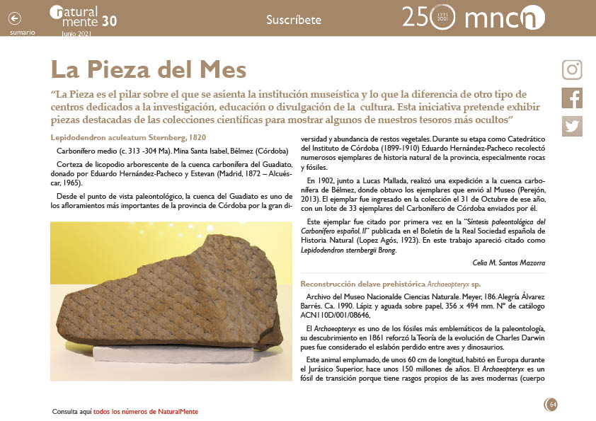 La Pieza es el pilar sobre el que se asienta la institución museística y lo que la diferencia de otro tipo de centros dedicados a la investigación, educación o divulgación de la cultura. Esta iniciativa pretende exhibir piezas destacadas de las colecciones científicas para mostrar algunos de nuestros tesoros más ocultos.