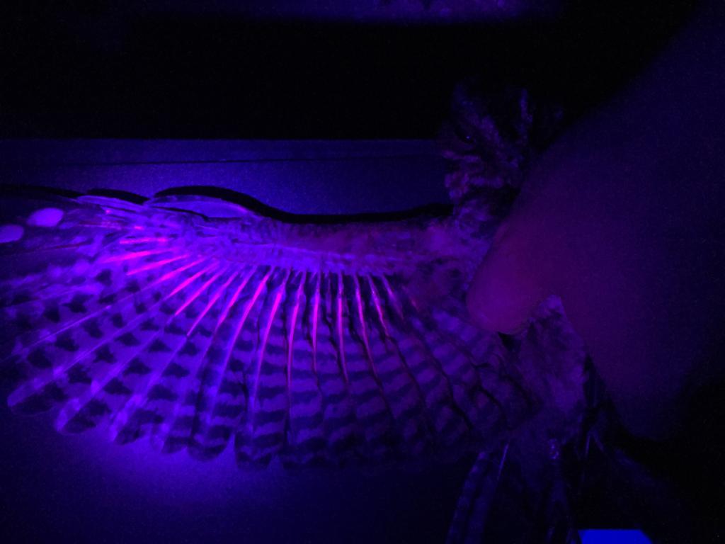 “En este reducido grupo, que representa apenas un 5% de todas las aves, encontramos también un pigmento enigmático: las porfirinas. Una peculiaridad de estas moléculas, que en condiciones normales son invisibles al ojo humano, es que al estimularse artificialmente con un haz de luz ultravioleta emiten fluorescencia de un color rosa brillante. Lo cierto es que se sabe realmente poco sobre las posibles funciones de esta extraña coloración”, apunta la investigadora del MNCN Iraida Redondo.