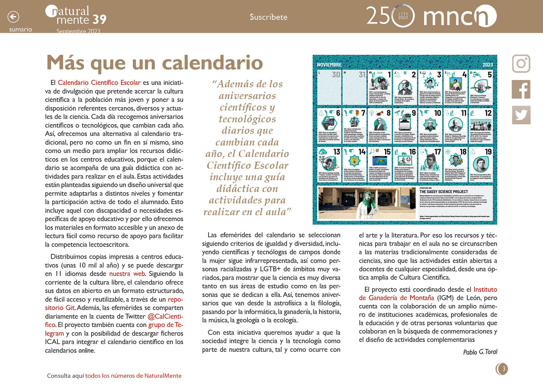 El Calendario Científico Escolar es una iniciativa de divulgación que pretende acercar la cultura científica a la población más joven y poner a su disposición referentes cercanos, diversos y actuales de la ciencia. Cada día recogemos aniversarios científicos o tecnológicos, que cambian cada año. Así, ofrecemos una alternativa al calendario tradicional, pero no como un fin en sí mismo, sino como un medio para ampliar los recursos didácticos en los centros educativos, porque el calendario se acompaña de una guía didáctica con actividades para realizar en el aula. Estas actividades están planteadas siguiendo un diseño universal que permite adaptarlas a distintos niveles y fomentar la participación activa de todo el alumnado. Esto incluye aquel con discapacidad o necesidades específicas de apoyo educativo y por ello ofrecemos los materiales en formato accesible y un anexo de lectura fácil como recurso de apoyo para facilitar la competencia lectoescritora.