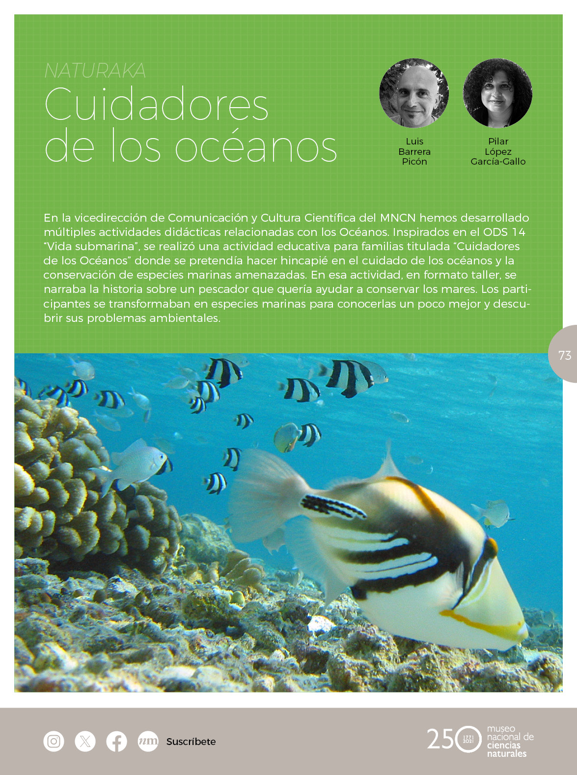 En la vicedirección de Comunicación y Cultura Científica del MNCN hemos desarrollado múltiples actividades didácticas relacionadas con los Océanos. Inspirados en el ODS 14 “Vida submarina”, se realizó una actividad educativa para familias titulada “Cuidadores de los Océanos” donde se pretendía hacer hincapié en el cuidado de los océanos y la conservación de especies marinas amenazadas. En esa actividad, en formato taller, se narraba la historia sobre un pescador que quería ayudar a conservar los mares. Los participantes se transformaban en especies marinas para conocerlas un poco mejor y descubrir sus problemas ambientales.