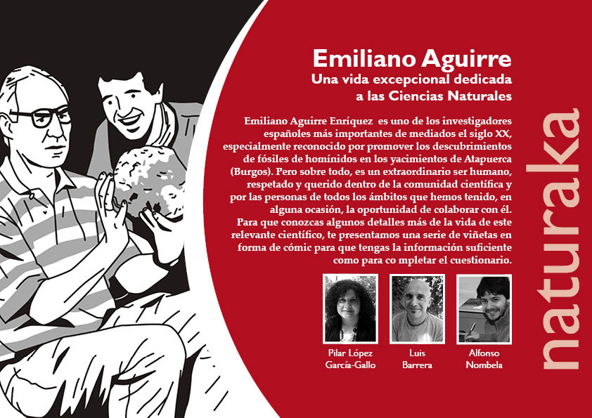 Emiliano Aguirre Enríquez es uno de los investigadores españoles más importantes de mediados el siglo XX, especialmente reconocido por promover los descubrimientos de fósiles de homínidos en los yacimientos de Atapuerca (Burgos). Pero sobre todo, es un extraordinario ser humano, respetado y querido dentro de la comunidad científica y por las personas de todos los ámbitos que hemos tenido, en alguna ocasión, la oportunidad de colaborar con él. Para que conozcas algunos detalles más de la vida de este relevante científico, te presentamos una serie de viñetas en forma de cómic para que tengas la información suficiente como para completar el cuestionario.