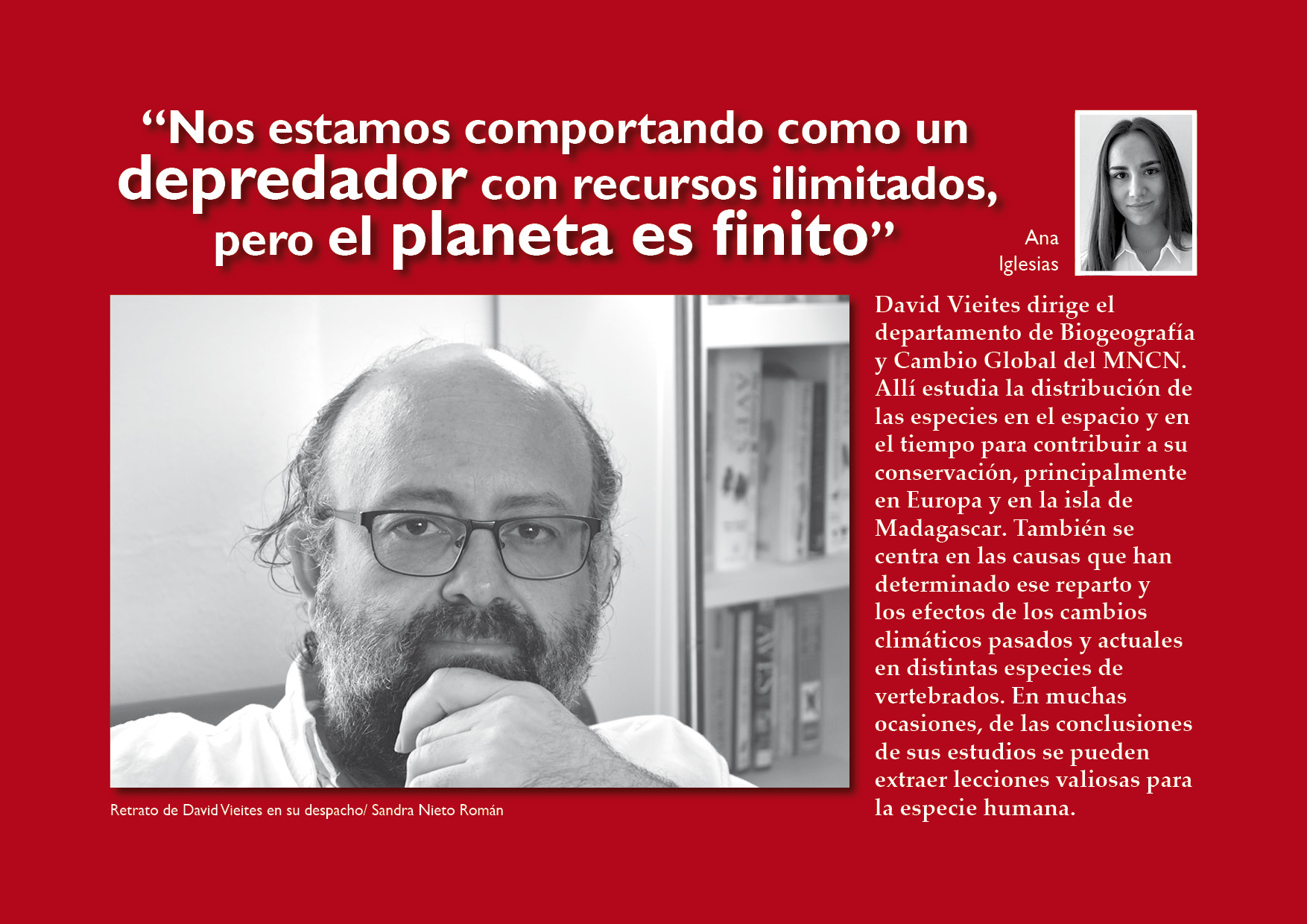 David Vieites dirige el departamento de Biogeografía y Cambio Global del MNCN. Allí estudia la distribución de las especies en el espacio y en el tiempo para contribuir a su conservación, principalmente en Europa y en la isla de Madagascar. También se centra en las causas que han determinado ese reparto y los efectos de los cambios climáticos pasados y actuales en distintas especies de vertebrados. En muchas ocasiones, de las conclusiones de sus estudios se pueden extraer lecciones valiosas para la especie humana.
