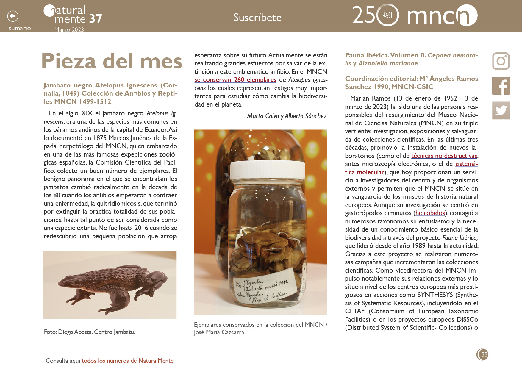 Pieza del mes Piezas del mes instaladas en el MNCN entre el 15 de diciembre de 2022 y el 15 de marzo de 2023 Publicado en NaturalMente 37 Autor Santiago Merino Documentación Artículo en formato pdf Te podría interesar Pieza del mes NM36 Santiago Ramón y Cajal, nuestro nobel más polifacético Contacto