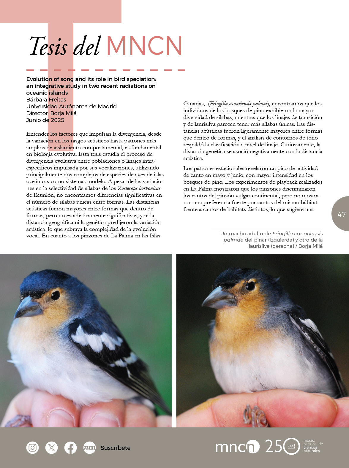 Tesis del MNCN en NaturalMente 47 Descubre las tesis que se han desarrollado en el MNCN en este número de NaturalMente 47 Publicado en NaturalMente 47 Autores Bárbara Freitas Marina García del Río Documentación Artículo en formato PDF Contacto
