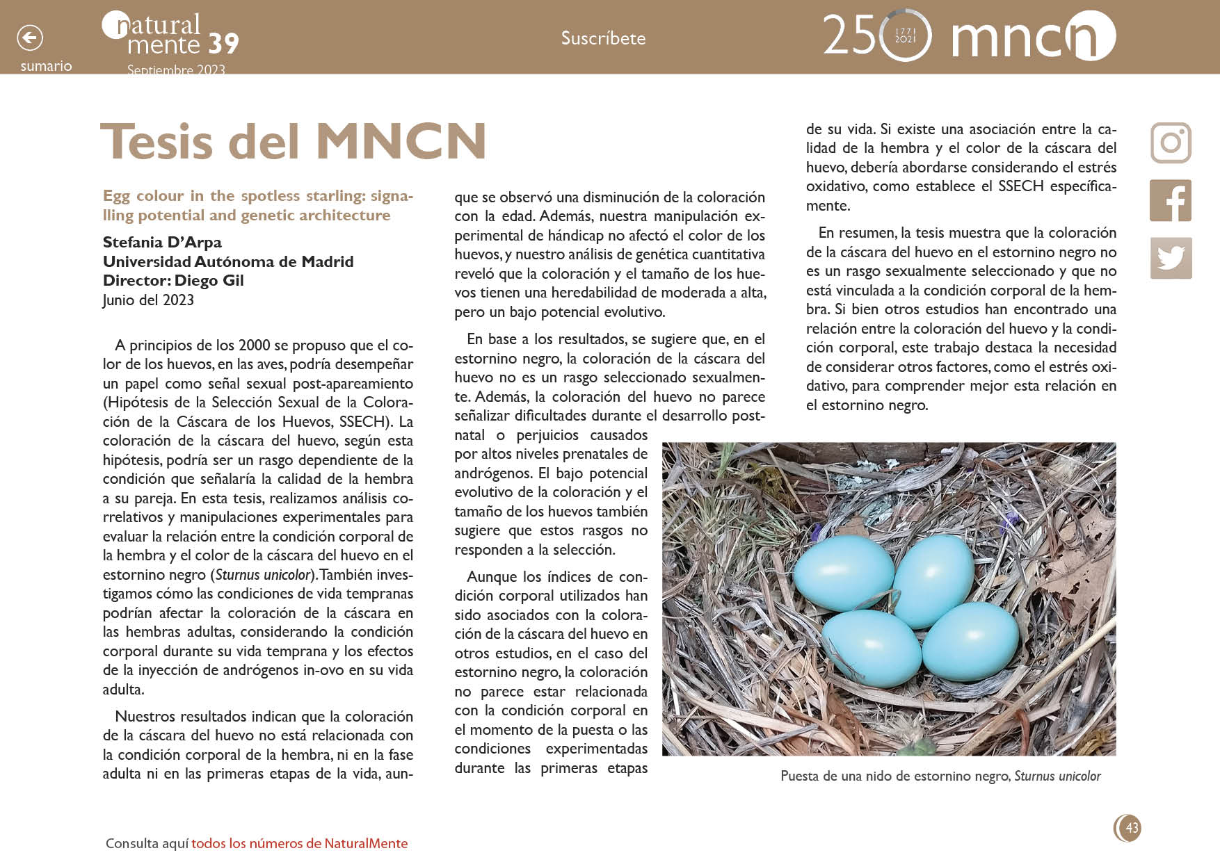 Tesis del MNCN nm39 Tesis leídas en el MNCN entre el 15 de junio y el 15 de septiembre de 2023 Publicado en NaturalMente 39 Autores Stefania D'Arpa Lucía Sainz Escudero Documentación Artículo en formato pdf Contacto