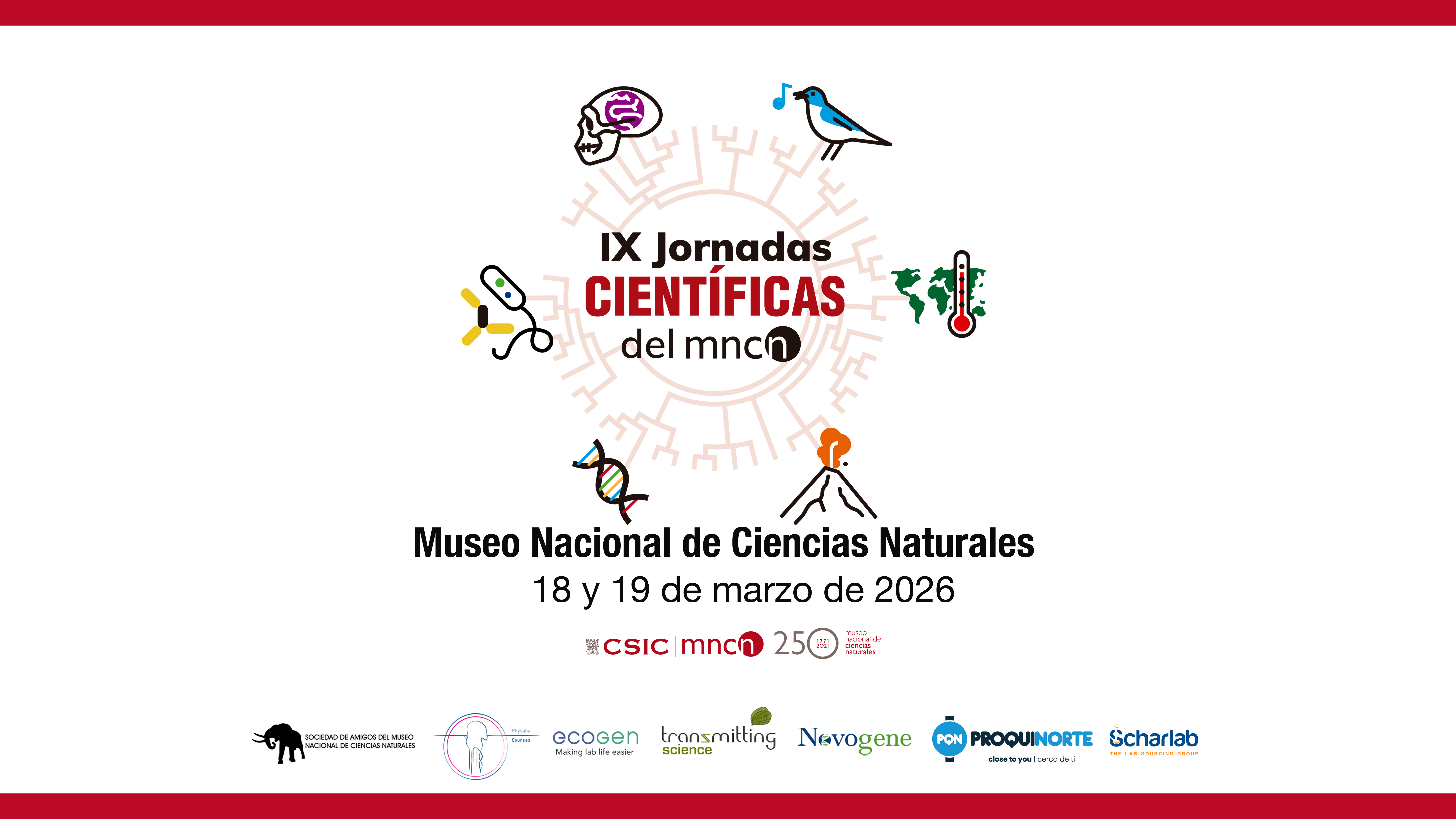 arzo de 2026 celebramos las IX Jornadas Científicas del MNCN-CSIC. Reunirá a más de 150 participantes vinculados al MNCN, contará con charlas plenarias de los Dres. Isabel Reche (Universidad de Granada) y Frédérik Saltré (University of Technology Sydney) y más de 60 comunicaciones impartidas por investigadores, técnicos y estudiantes pertenecientes a los seis departamentos de investigación del Museo. Las Jornadas tienen como objetivo dar a conocer la investigación más actual desarrollada en nuestro centro, facilitar la exposición de resultados, el intercambio de ideas y promover la colaboración de una plantilla diversa y multidisciplinar. Este evento pone de manifiesto cómo las investigaciones desarrolladas en el MNCN-CSIC nos ayudan a entender la complejidad de los procesos naturales, afrontar los retos medioambientales y mitigar la pérdida de biodiversidad en nuestro planeta.
