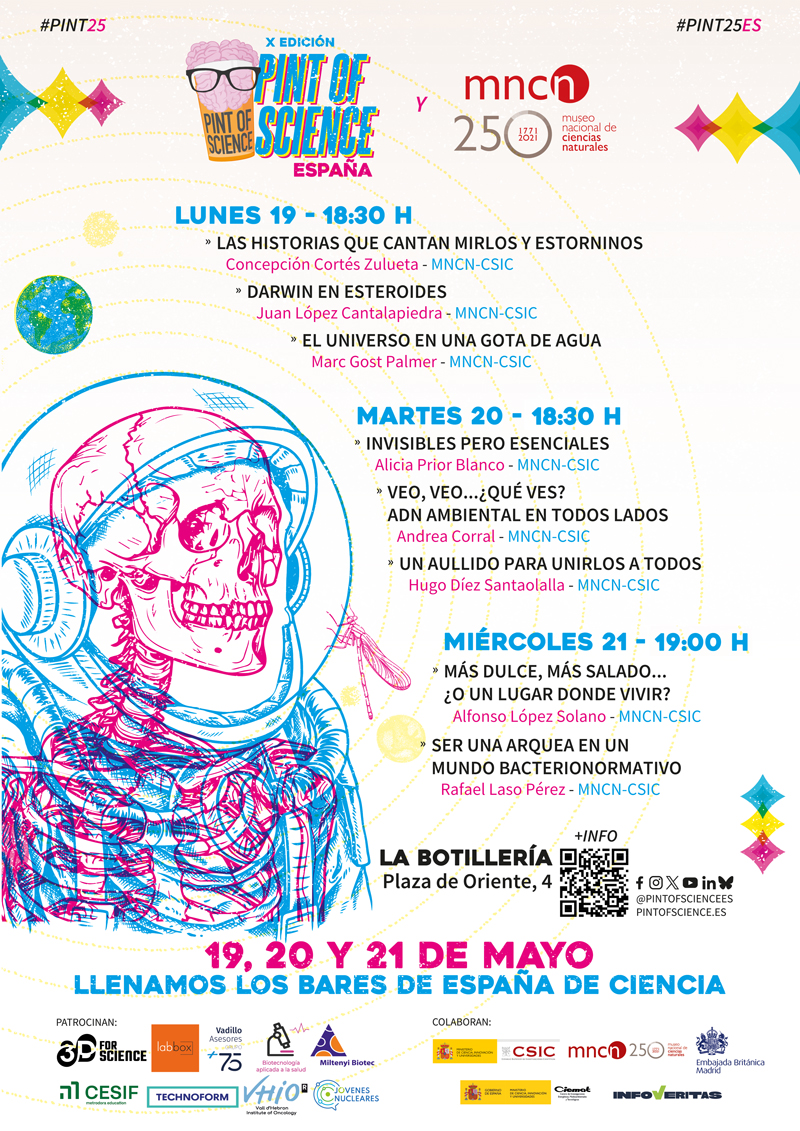 La semana que viene, el lunes 19, martes 20 y miércoles 21 a partir de las 18.30 investigadoras y científicos del MNCN-CSIC estarán en La Botillería de la Plaza de Oriente contando la ciencia que hacen dentro del festival Pint of Science. Además de las personas del cartel, el lunes 19 Almudena Estalrich contará que “La Paleoclave está en el microdetalle” en el café Gijón y Luis Pertierra y Diego Jiménez nos explicarán la “Biodiversidad en tres dimensiones” en el Café Manuela.